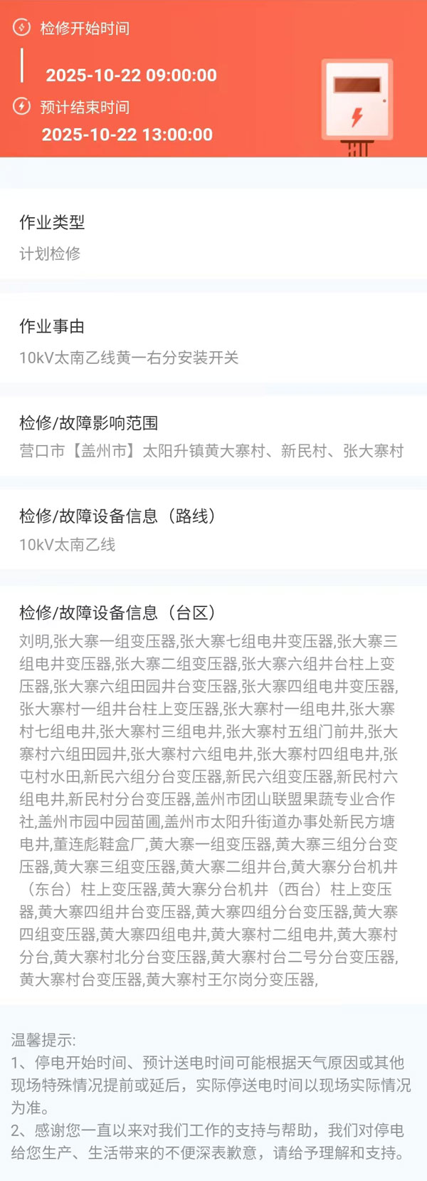 上一篇:2025年10月22日 盖州市电网检修公告 下一篇:2025年10月22日 盖州市电网检修公告