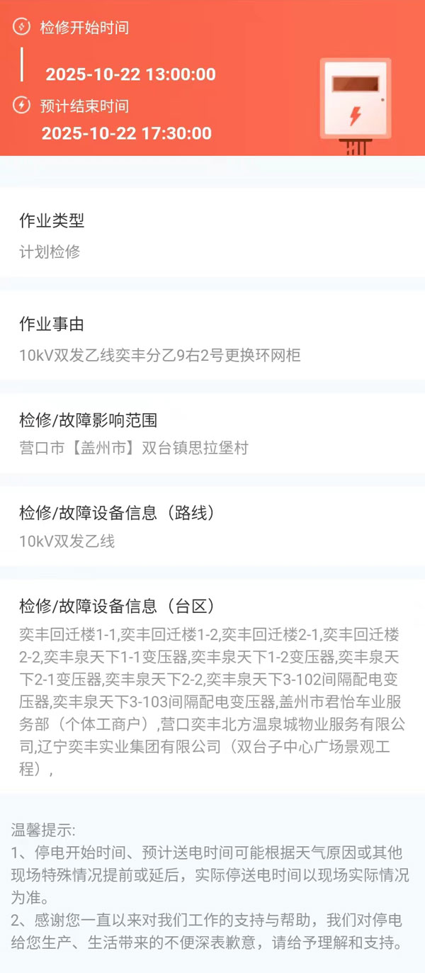 上一篇:2025年10月22日 盖州市电网检修公告 下一篇:2025年10月23日 盖州市电网检修公告