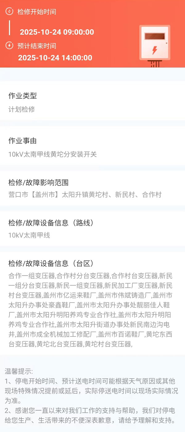 2025年10月24日 盖州市电网检修公告