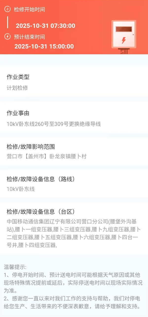 上一篇:2025年10月30日 盖州市电网检修公告 下一篇:2025年10月31日 盖州市电网检修公告