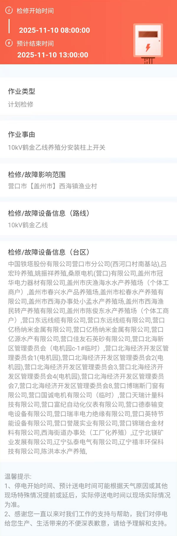 上一篇:2025年11月06日 盖州市电网检修公告 下一篇:2025年11月12日 盖州市电网检修公告