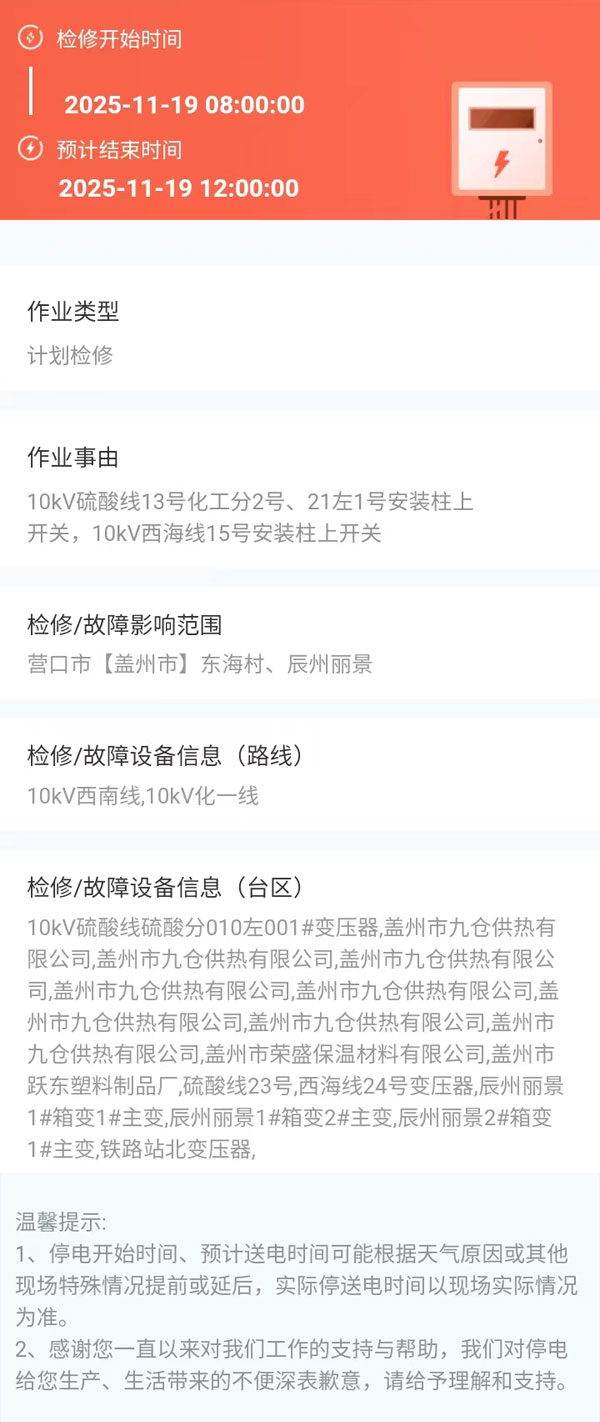 上一篇:2025年11月18日 盖州市电网检修公告 下一篇:2025年11月19日 盖州市电网检修公告