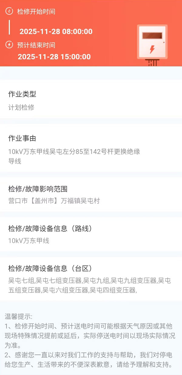 上一篇:2025年11月28日 盖州市电网检修公告 下一篇:2025年12月01日 盖州市电网检修公告