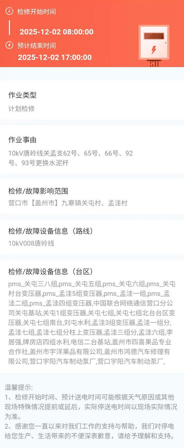 上一篇:2025年12月02日 盖州市电网检修公告 下一篇:2025年12月04日 盖州市电网检修公告