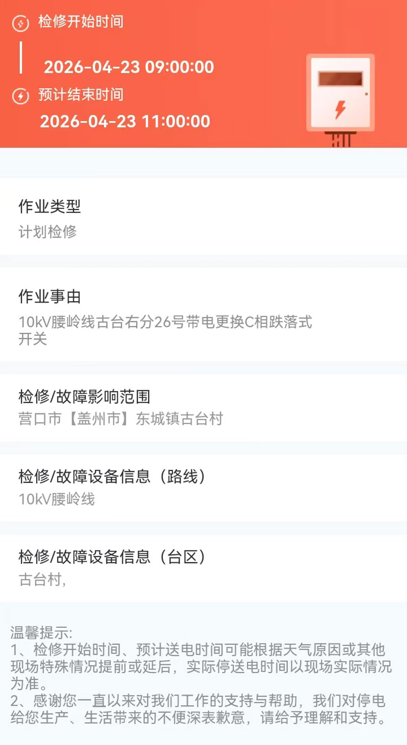 2026年04月23日 盖州市电网检修公告