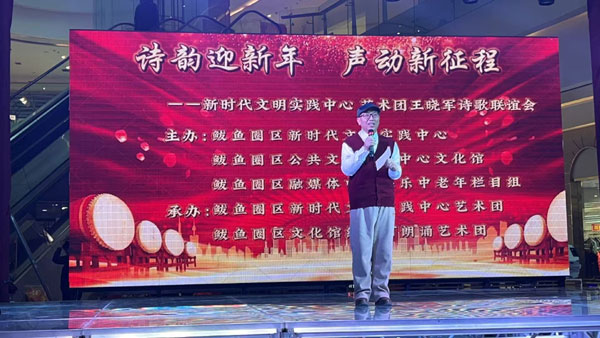 12月12日下午,营口市鲅鱼圈万隆广场内诗意盎然、暖意融融,“诗韵迎新年 声动新征程”新时代文明实践中心艺术团王晓军诗歌联谊会在此精彩启幕,为鲅鱼圈区的群众带来了一场浸润心灵的文化盛宴。营口市鲅鱼圈区作家协会主席、辽宁省诗歌协会会长、鲅鱼圈区文化馆副馆长等多位文化界嘉宾应邀莅临活动现场。