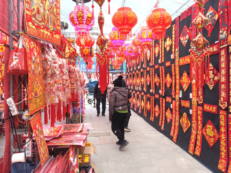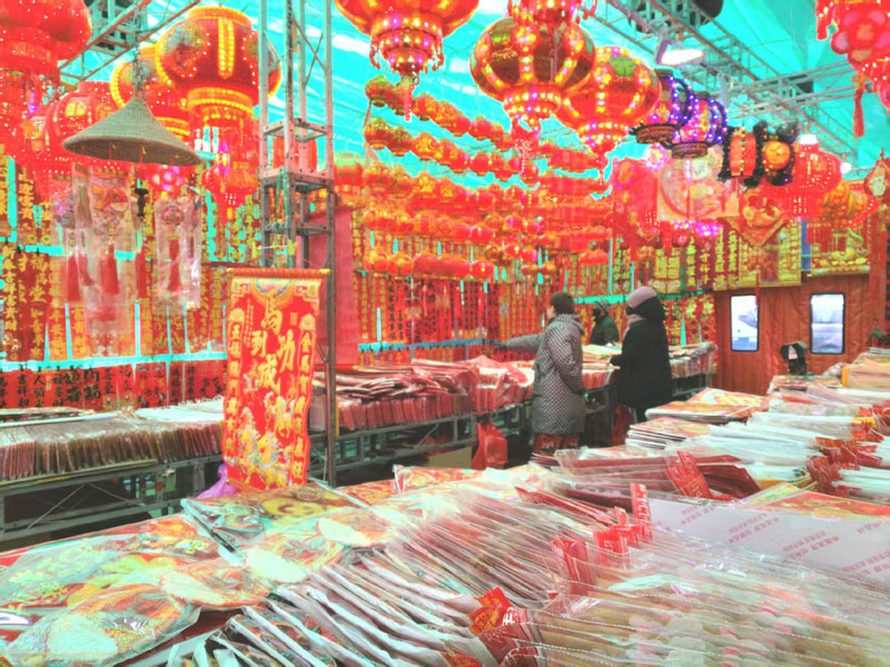 1月30日,来到营口市通惠门市场东面的马路边,见到新搭建的一排简易房里正在出售铺天盖地的春联、福字和灯笼。