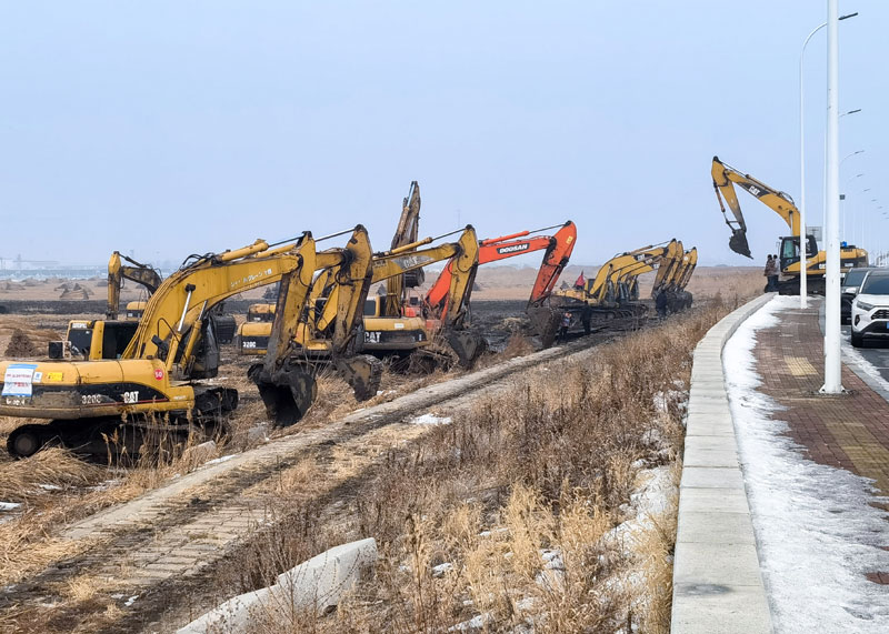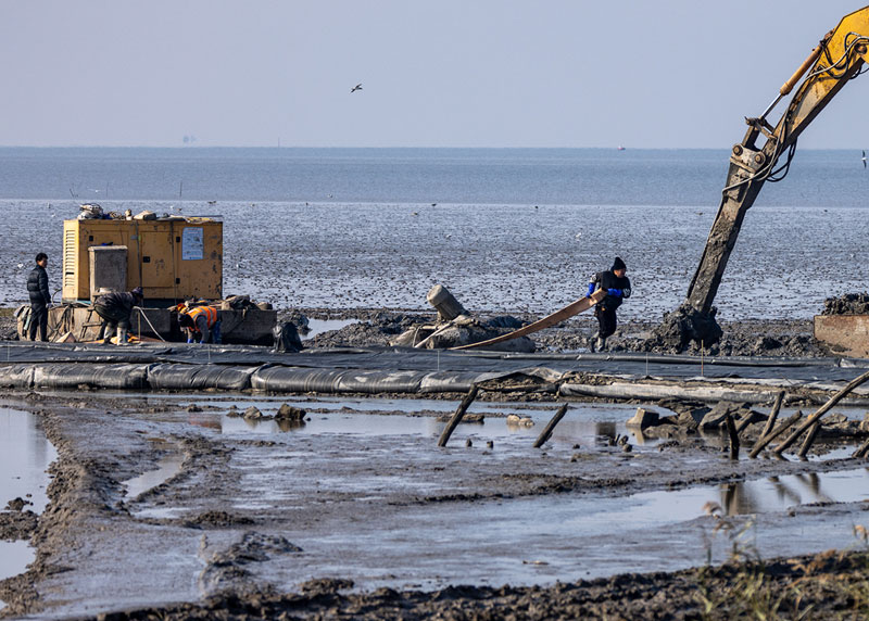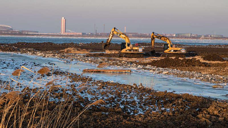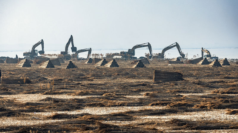 此前我们路经这里适远远就能听到机车作业的轰鸣声,看到芦苇深处挖掘机挥动的动臂,当大片芦苇开割后,在滩涂边上施工的挖掘机和运输卡车忙碌的情景才展露出来。