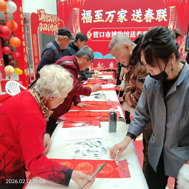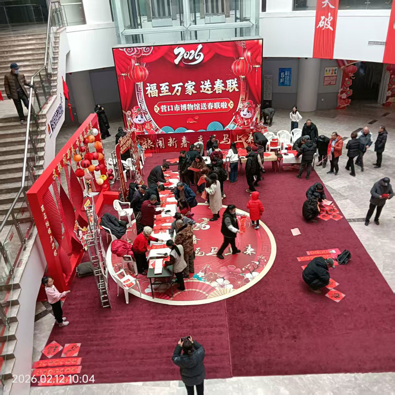 腊月二十五,营口市图书大厦一楼大厅宽敞明亮,舞台和背景以大红为底色,格外喜庆。“2026年福至万家送春联活动”在这里隆重举行。今天,我市的楹联学会的书法家们齐聚一堂,现场挥毫泼墨,为与会的百余位嘉宾写联送福。人们争先恐后,选出心仪的诗句,在欢乐的气氛中,加深了对传统文化的认同,对营口楹联学会不辞辛苦,义务为群众服务,和市图书大厦面向社会,积极投入,精心组织大加赞扬。