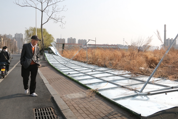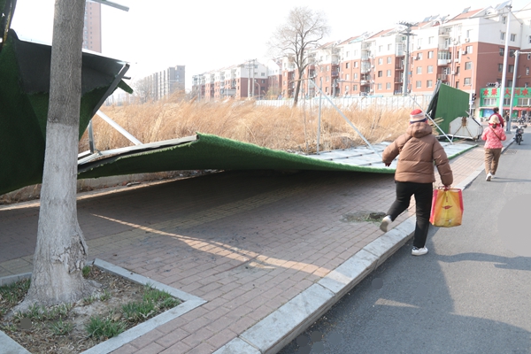 —— 营口大风太任性 围栏“躺平”挡路啦