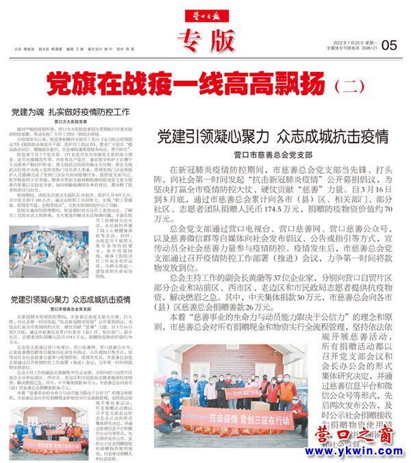 (一)坚持政治引领,狠抓内部治理,确保总会工作稳定前进。总会党支部组织党员认真学习习近平新时代中国特色社会主义思想,特别是习近平同志关于发展慈善事业的重要讲话精神,全面落实“三重一大”、“三会一课”等党建制度,充分发挥党支部在总会工作中的战斗堡垒作用和党员的先锋模范,引领总会工作团队形成积极向上、争先创优的良好工作氛围。2022年7月25日《营口日报》以《党建引领凝心聚力,众志成城抗击疫情》为题报道了市慈善总会党支部的抗疫事迹,并被市委组织部通报表扬。第三届会员代表大会之后,总会进一步完善了内部管理制度,制定了《人事管理制度》《财务管理制度》《项目管理办法》《档案管理制度》《证书管理制度》《印章管理制度》等内部规范性制度。本着“慈善事业的生命力与动员能力取决于公信力”的理念和原则,总会通过定期召开支部会、会长办公会和会长办公会扩大会议,对所有捐赠现金和物资实行全流程管理,坚持做到“精准对接、快进快出、物走账清”,并将捐赠款物及时送达最需要的地方和单位,确保每一笔捐赠款物都能发挥最大效用,被营口市民政局授予5A级社会组织,荣获市民政局民政工作先进集体称号。