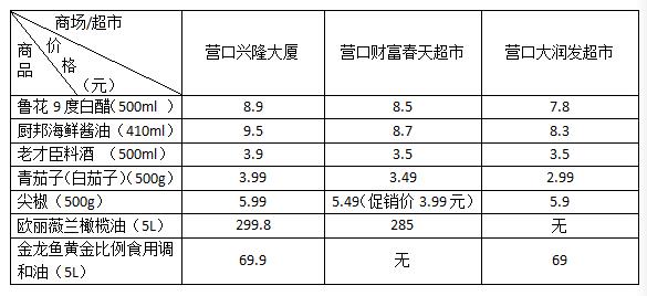 生活常用调味料有鲁花9度白醋(500ml),营口兴隆大厦售价8.9元,营口财富春天超市售价8.5元,大润发超市售价7.8元;厨邦海鲜酱油(410ml),营口兴隆大厦售价9.5元,营口财富春天超市售价8.7元,大润发超市售价8.3元;老才臣料酒 (500ml),营口兴隆大厦售价3.9元,营口财富春天超市和大润发超市均售价3.5元。蔬菜类有青茄子(也成白茄子),营口兴隆大厦售价3.99元,营口财富春天超市售价3.49元,大润发超市售价2.99元;尖椒,营口兴隆大厦售价5.99元,营口财富春天超市售价5.49元(促销价为3.99元),大润发超市售价5.9元。欧丽薇兰橄榄油(5L),营口兴隆大厦售价299.8元,营口财富春天超市售价285元;金龙鱼黄金比例食用调和油(5L),营口兴隆大厦售价69.9元,大润发69元。