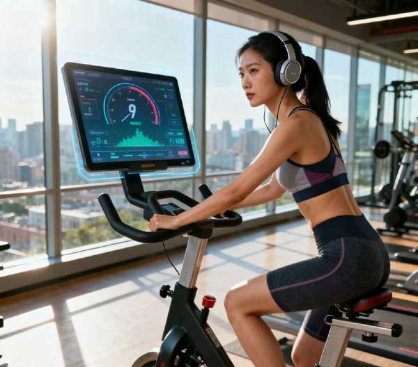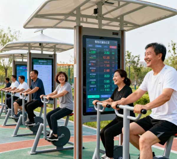 不一会儿,青壮年区域的智能跑步机开始亮起屏幕。有人扫码登录,实时心率、卡路里消耗便随着步伐跳动在显示屏上;旁边的智能力量训练器前,年轻人握着把手调整重量,器材自带的传感器会悄悄记录运动轨迹,同步到手机APP里,方便回家后复盘训练强度。最热闹的要数AI大屏幕前,几辆智能健身自行车排成一排,骑行者盯着屏幕里的虚拟赛道,脚下的踏板越踩越快,屏幕上的“骑行里程”不断攀升,偶尔有人超过前面的“对手”,还会笑着喊一声“再加把劲”,汗水顺着脸颊滑落,却透着满满的活力。