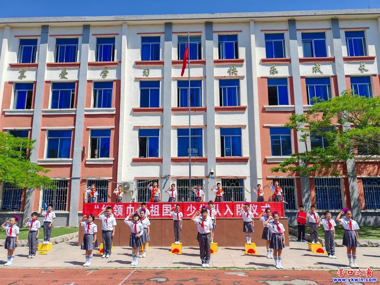 在鲜艳的队旗下,少先队老队员在党的指引下,带领新队员庄严宣誓。