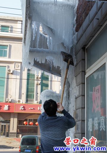 楼下小卖店的男主人用铁锹砍掉尖尖的冰溜子