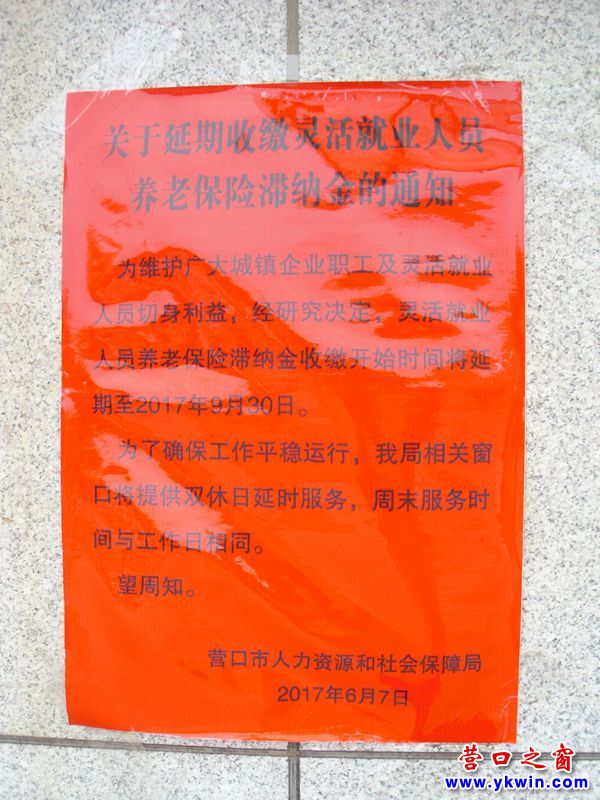 日前,营口市人力资源和社会保障局发出《关于延期收缴灵活就业人员养老保险滞纳金的通知》。《通知》称:为维护广大城镇职工及灵活就业人员的切身利益,经研究决定,灵活就业人员养老保险滞纳金收缴开始时间延长至2017年9月30日。为确保缴费工作平稳运行,我局相关窗口将提供双休日延时服务,即周末服务时间与工作日相同。