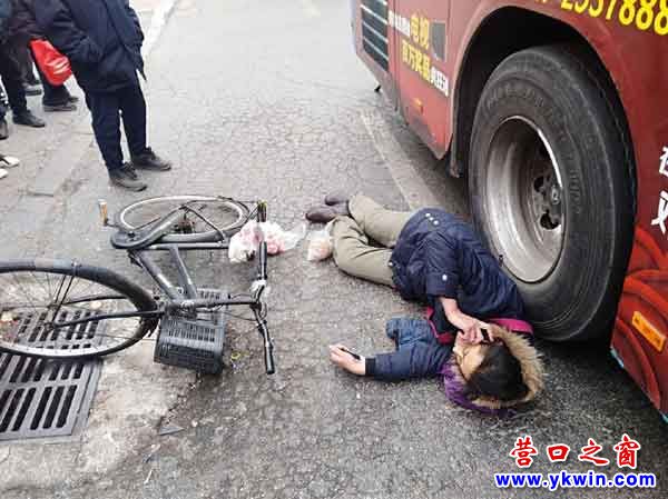 2月18日下午三时许,营口市大润发超市附近由西向东二路公交车站点,一辆公交车疑似在进站过程中将一名女性骑车人卷入车轱辘外侧。