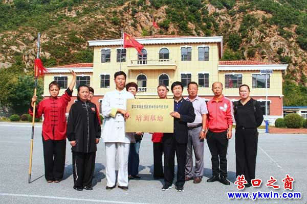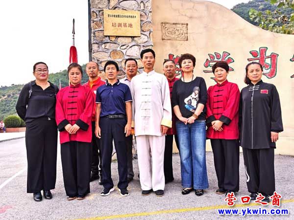 双方在“营口市鲅鱼圈区武术协会传统武术培训基地”牌匾下合影留念。