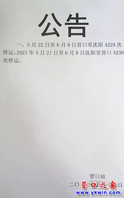 因受疫情影响,自2021年5月21日起至6月8日止,沈阳开往营口的4230次列车停运;自5月22日起至6月9日止,营口开往沈阳的4229次列车停运。