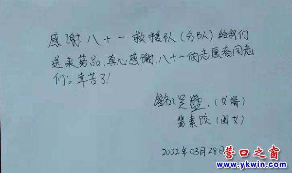接到反馈后团队几位领导利用视频连线方式达成一致意见,尽全力满足辖区居民日常生活用药,保障他们健康防疫。为了避免交叉感染、也为了减轻区医院等主力防疫医院的工作压力,他们用各自的渠道联系药房购药。在先后联系了老边药房、博爱药房、新港药房、福聚和药房等十几家药房后配齐了群众需要药品。通过社区向区防指办申请药品绿色通道,3月27日当晚第一时间将药品传递到村民手中,村民在连声感谢的同时写下朴实的话语对志愿者表达敬意!