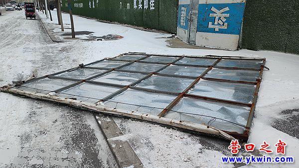 (营口之窗“百姓说事”)12月15日,营口市站前区富甲天下地产(人民公园东门西侧)绿围栏被大风吹倒,行人需注意道路交通安全。