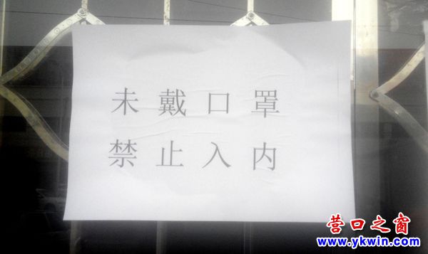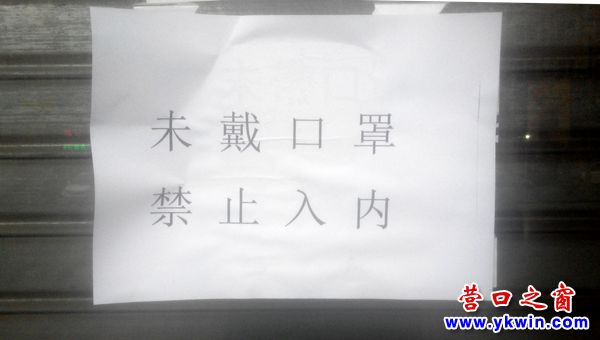 营口之窗网 胡然 3月7日,来到营口市通惠门附近,欣喜地见到几天前各门市房门上张贴的“未带口罩”全部由“未戴口罩”取代。