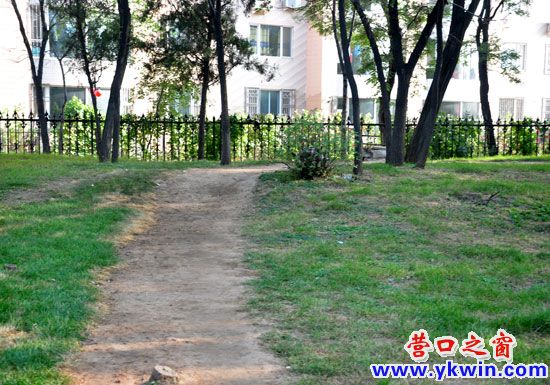 公园内的草坪已被踩出一条毛道,看来不像是一年内形成的。