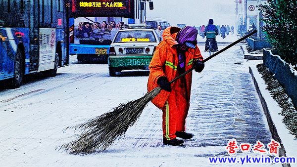 每次营口的雪中都会出现他们的勤劳的身影,一身橘黄色的服装,一把大扫把,把汗水挥洒在雪中,把清洁留给市民百姓。