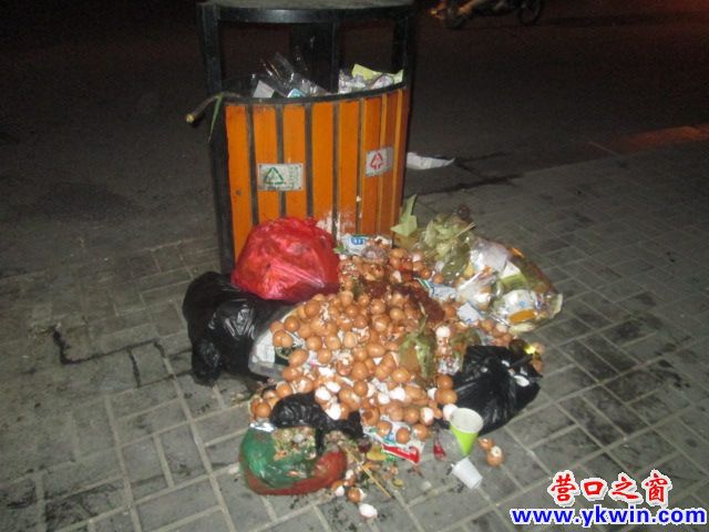 晚8点左右,熊岳高中附近,路边的垃圾箱外满地鸡蛋壳。