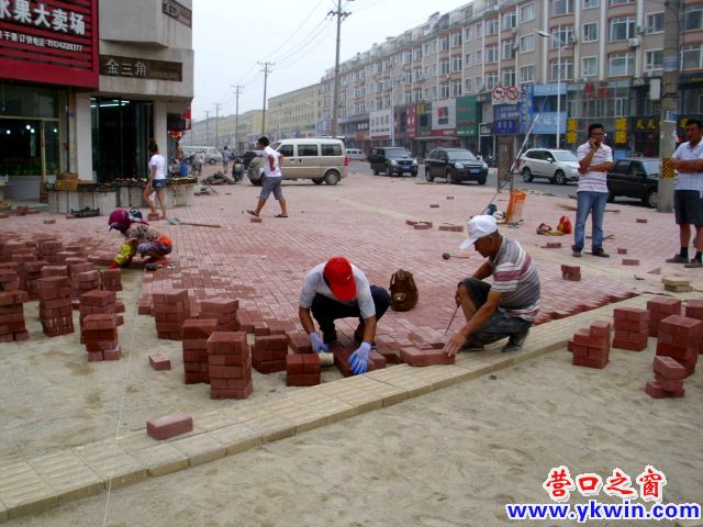 经过一个多月的重修,营口建设街东部的马路已经修好。眼下,更换此路两边地砖的战斗又已进入尾声。7月24日,我在现场见到好几组工人正在紧锣密鼓的铺地砖。再过几天.,这里的所有工程将全面竣工。崭新的黑马路和漂亮的红地砖使这里的旧貌换了新颜,希望它也能让来到这里的市民变得更加文明。