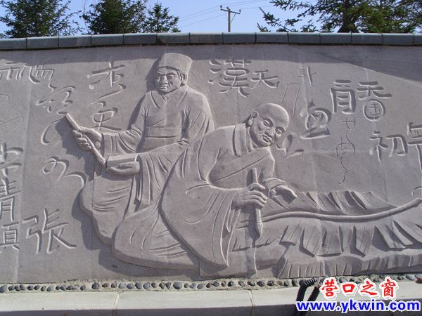 营口营东新城,欢心甸大街边有四面石刻画墙,一面墙刻着一个主题,中国古代书法、京剧、中医和武术大师