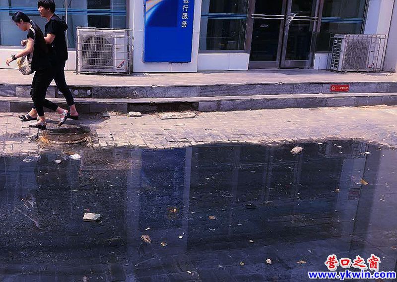 在营口大润发超市对过的中国建设银行营口站前支行营业厅门前,笔者看到,一处排水井正从井盖往外冒水,人行道被水淹没,路面变成了泽国。据建行工作人员介绍,排水井冒水至少有20多天了。