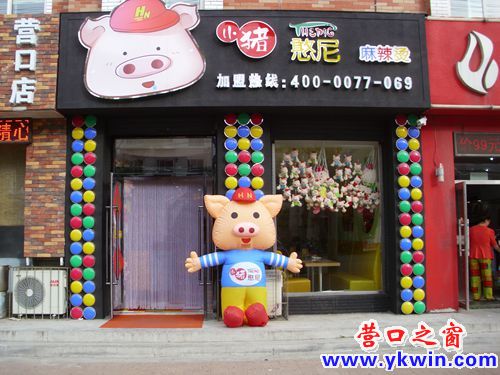 5月27日,营口新兴大街边一家刚开业不久的餐饮店的门前站着一个气吹的猪孩在迎宾。该店用这个廉价的猪孩迎宾既节约了费用,又令人愉悦,真是两全其美啊!猪孩的愿望就是让顾客吃好,同时也赚得盆满钵满开更大的店,发更大的财。