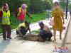 8月24日上午,营口市楞严寺公园来了一支“红色娘子军”舞蹈团。她们穿着红军的服装,播放《红军不怕远征难》和《十送红军》歌曲,打着站前区慈善总会志愿者的旗帜,跳着广场舞。