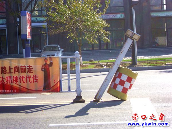 11月4日,从营口太和北街穿过渤海大街见到位于街中隔离墙前面的“排头兵”倾斜45度靠在临近的花桶上,如果没有这个花桶,恐怕就非倒不可了。它之所以欲倒,是因为脚下锈蚀,并非外力撞击。