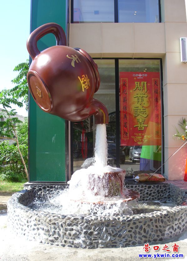6月21日,再次来到位于营口市滨海大街边的茗茶店,见到几天前还假装往茶碗里倒水的那个特大茶壶真的往茶碗里倒“茶水”了,其“茶水”水柱之粗都超过了家用的烟筒。原来,这竟是一个货真价实的景观喷泉,用来装点门面,招徕顾客。
