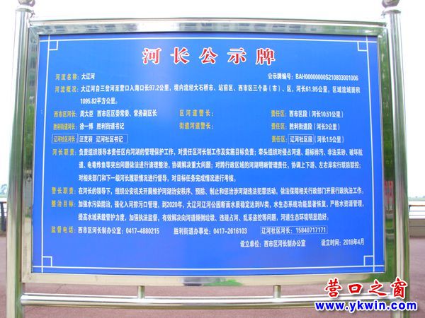 近日,游览营口大辽河见到河边隔几百米就竖立一块牌子,上面写着:《河长告示牌》5个大字及其河长公示内容。主要内容如下: