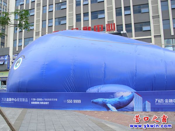 7月9日,来到营口市万达广场发现金融中心门前多出了一条巨大的“鲸鱼”,在“鲸鱼”的腹下写的是“鲸艳渤海湾”。以前商家举办活动摆放最大的动物也就是大象,在营口,让地球上体积最大的“鲸鱼”(蓝鲸)助阵的商业活动这还是头一回看到。其用意就是要把活动和事业做大,惊艳渤海湾。