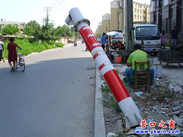 可能是由于某大货车冲撞的缘故,架设在营口市阳光人家小区北邻东昌街上的限高门横杆落地,剩下的两个门柱已经变成了歪“11”,其中一个门柱还向马路一方倾斜影响了交通。