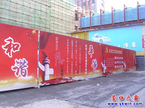 11月20日,从营口市新兴大街走过,见到一建筑工地围挡上打印的社会主义核心价值观的顺序出现了排列混乱,如“和谐”后面是“平等 ”,“平等 ”后面是“文明”。按照正确的顺序排列,“和谐”后面应该是“自由”,“文明”前面应该是“民主”。社会主义核心价值观的正确排列顺序是:富强、民主、文明、和谐、自由、平等、 公正、法治、爱国、敬业、诚信、友善.。