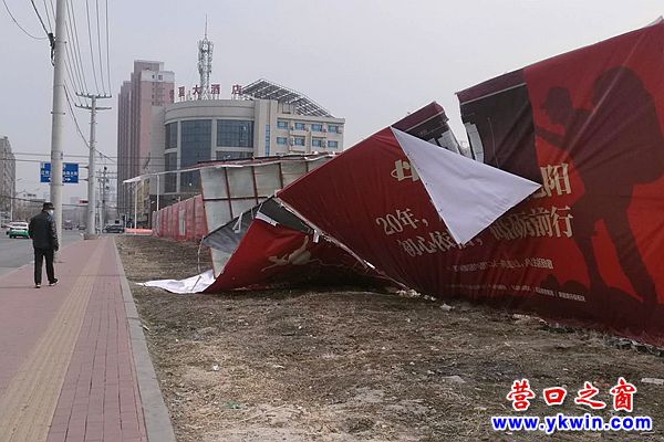 3月18日,营口市狂风大作,市区的最大阵风达到9级。位于西市区新兴大街华夏大酒店十字路口西侧(公交站点)路边的大幅广告围栏不堪重“吹”,连片 “躺”下。