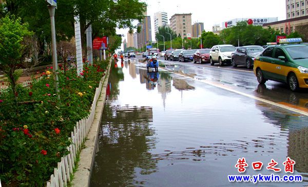 (营口之窗网讯 胡然)7月14日中午,营口市下了一场比较大的雨。由于下水井井口高于街(路)水平面,营口市大街小巷在下水井畅通的情况下积水仍形成了很多“小河”。其中,营口市总工会门前的渤海大街边的小河长达100多米,水深二三十厘米,6名环卫工人用了一个多小时才把这条小河里的水推进下水井里,在推水的过程中,环卫工人们个个浑身冒汗。
