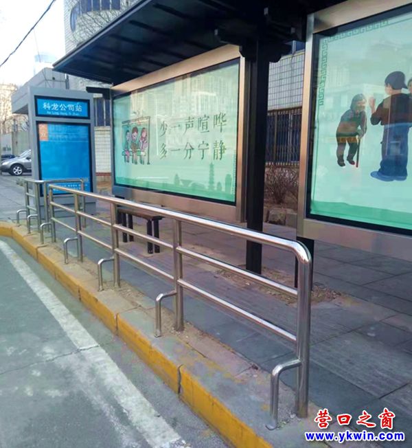 (营口之窗网讯 胡然)2月25日10时,从营口市市府路经过时,见到路两边的公交车站都各新增了一道护栏,显而易见是用来引导乘客排队上车的。这些公交车站的此种功目前在全市并不多见。