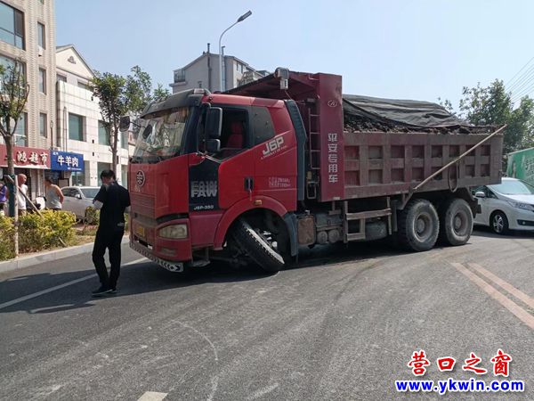 (营口之窗网讯 李凯)今天中午,在营口市西市区新兴大街中天新城南大门西侧看到,一行驶中的载重汽车突然左前轮脱落,整个车横在马路上,幸好未酿成交通事故。