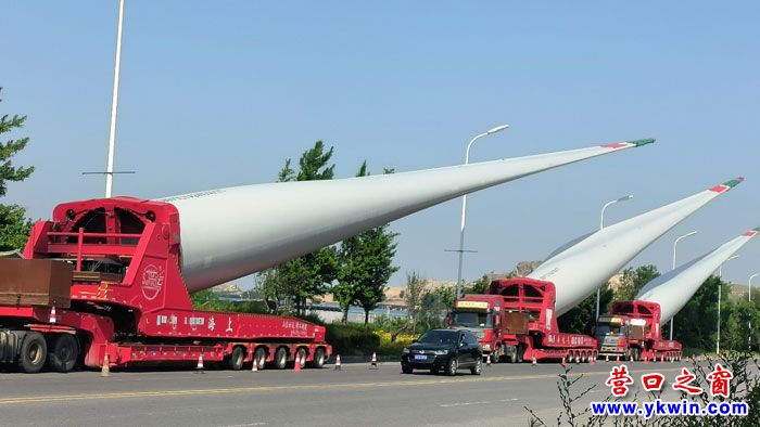 现在盖州市陈屯山上,机组正在吊装,施工单位向山上运送桨叶,一片桨叶长80多米,重达20多吨,向山上运送,一台大件车需要三台拖车牵引 ,还有一台400吨吊车配合,场面大气壮观。大力开发绿色能源,功在当代,利在千秋!