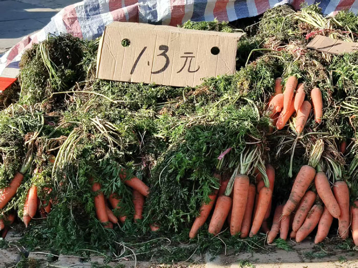 另据观察,10月31日,这个大菜市上同一堆胡萝卜已从10月20日的一元一斤涨到了一元三毛一斤。好在这个大菜市上的萝卜和大葱几乎没涨。