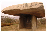 ① 石棚群中的地上石棚,其中1号石棚在底石板上有人骨、青铜短剑、剑把头、纺轮、骨针、陶器、串珠