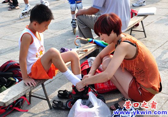 一名参加轮滑比赛小选手正在母亲的帮助下穿戴比赛装具