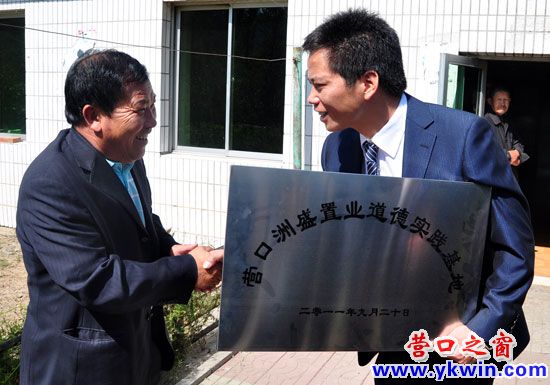 盖州市暖泉开发农场养老院院长崔玉祥(左一)接受 “营口洲盛置业道德实践基地“牌匾