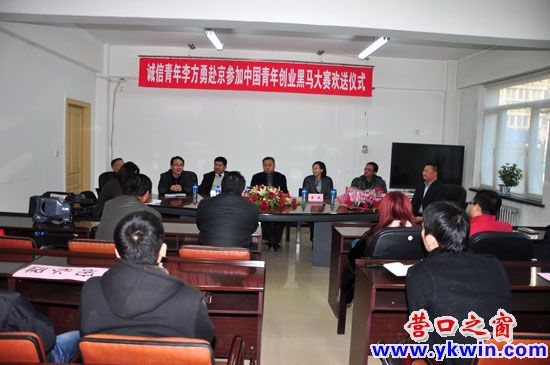 12月1日14时,营口团市委会议室里掌声齐鸣,由团市委举办的诚信青年李方勇赴京参加中国青年创业黑马大赛欢送仪式正在进行。市委宣传部副部长、市文明办主任康福州,团市委副书记童威,等领导以及方勇的团队和团市委YBC办公室及社会各界代表参加了欢送仪式。